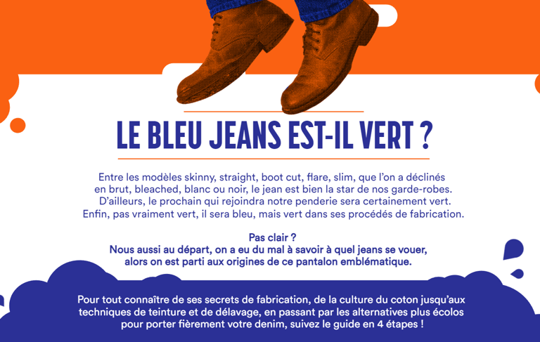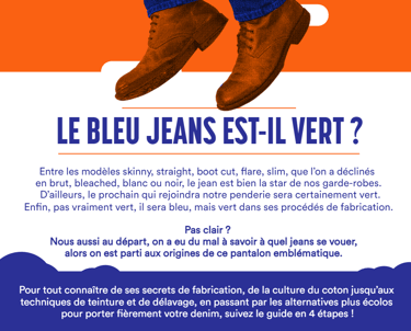 Enfin, pas vraiment vert, il sera bleu, mais vert dans ses procédés de fabrication.Pas clair ?Nous aussi au départ, on a eu du mal à savoir à quel jeans se vouer,alors on est parti aux origines de ce pantalon emblématique.Entre les modèles skinny, straight, boot cut, flare, slim, que l’on a déclinéspour porter fièrement votre denim, suivez le guide en 4 étapes ! (cliquer sur l'image pour en savoir +)